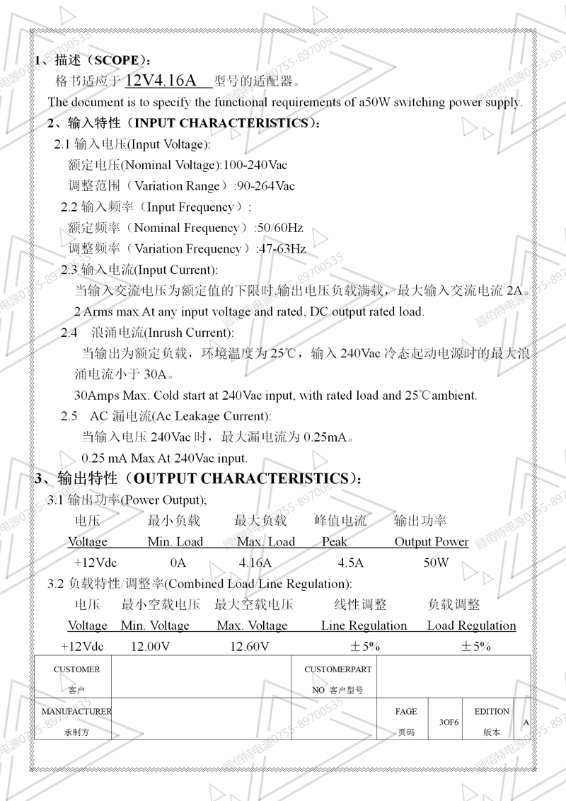 12V4.16A電源適配器規格書(60W)