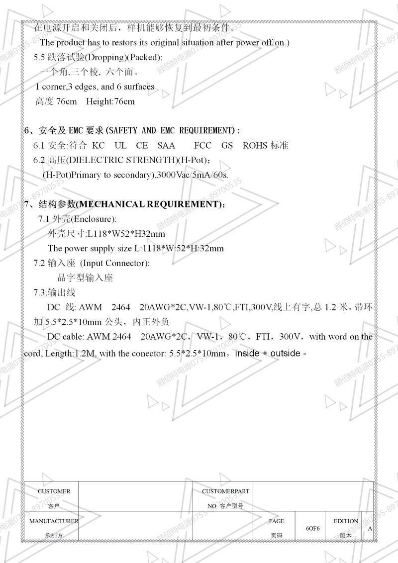19V3.5A電源適配器規格書